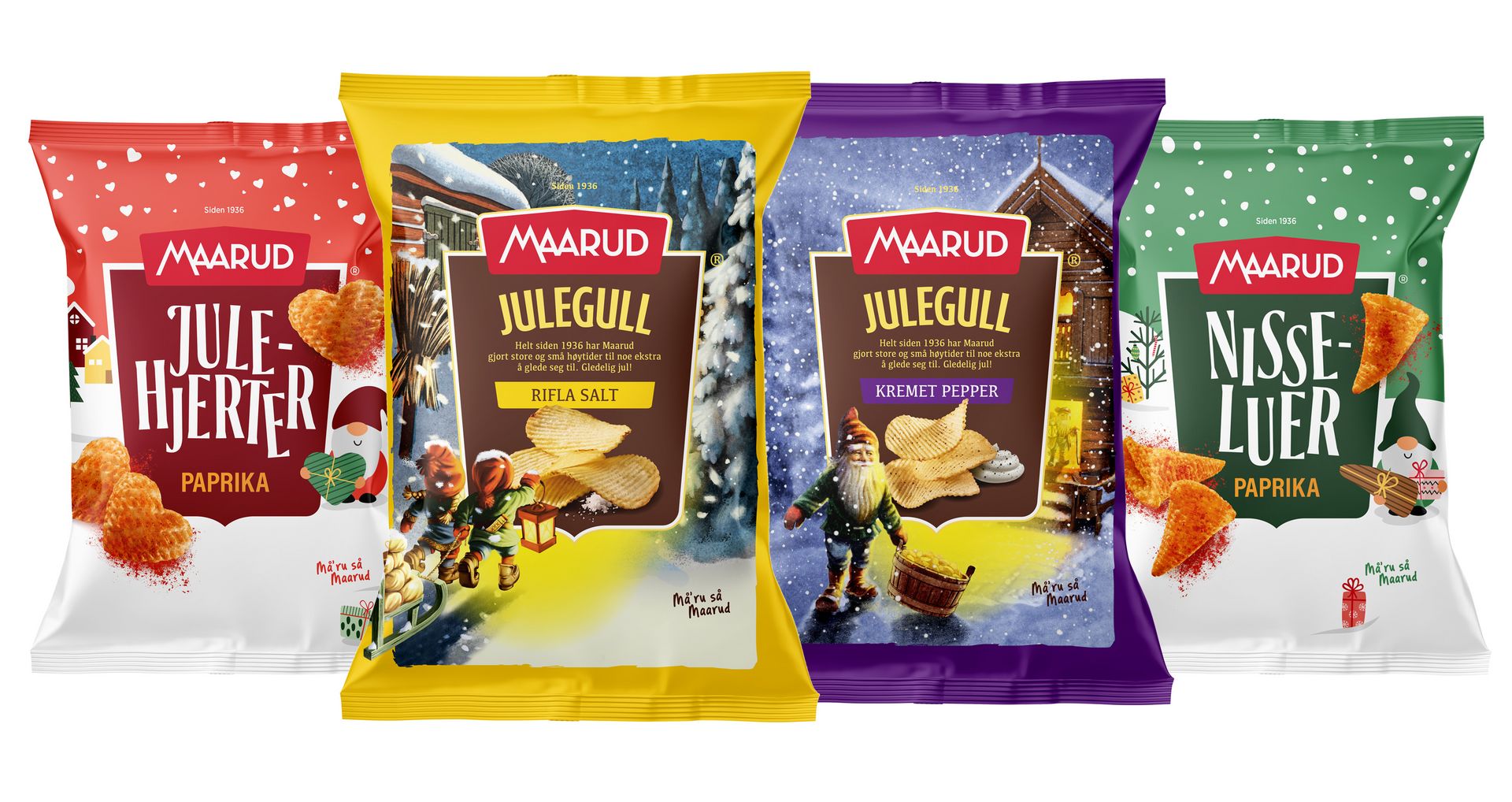 Alle produktene er laget av norske poteter og produsert på Maarud-fabrikken i Sør-Odal – ekte smak, norsk kvalitet og litt juleglede i hver pose.